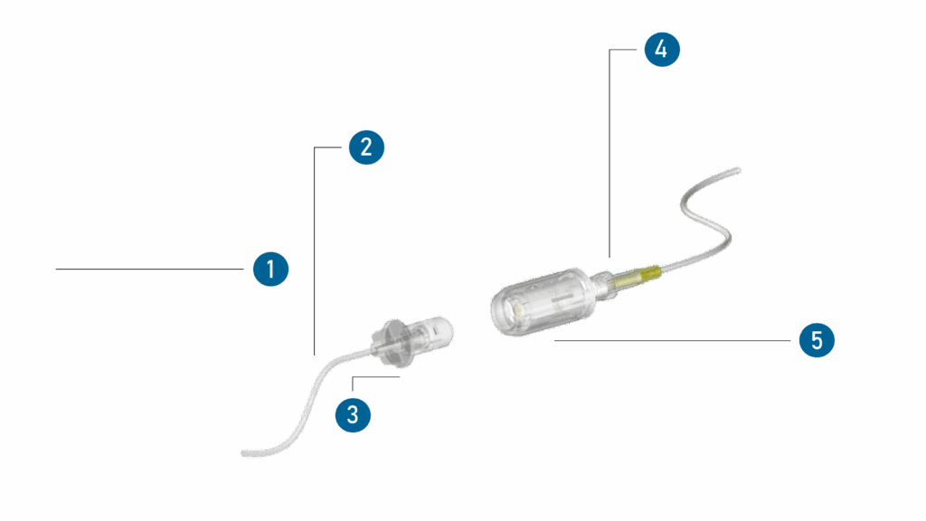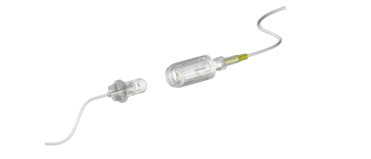 Die Stahlkanüle verbindet sich mit der ProSeal™-Injektionsstelle und schafft einen sterilen Flüssigkeitskanal für den Medikamententransfer