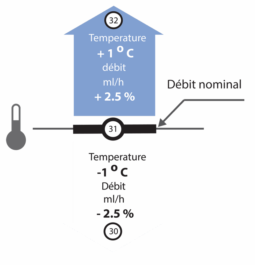 Tatsächlich führt jede Variation von 1° mehr oder weniger zu einer UNGEFÄHREN Schwankung des Durchflusses von plus oder minus 2,5%.