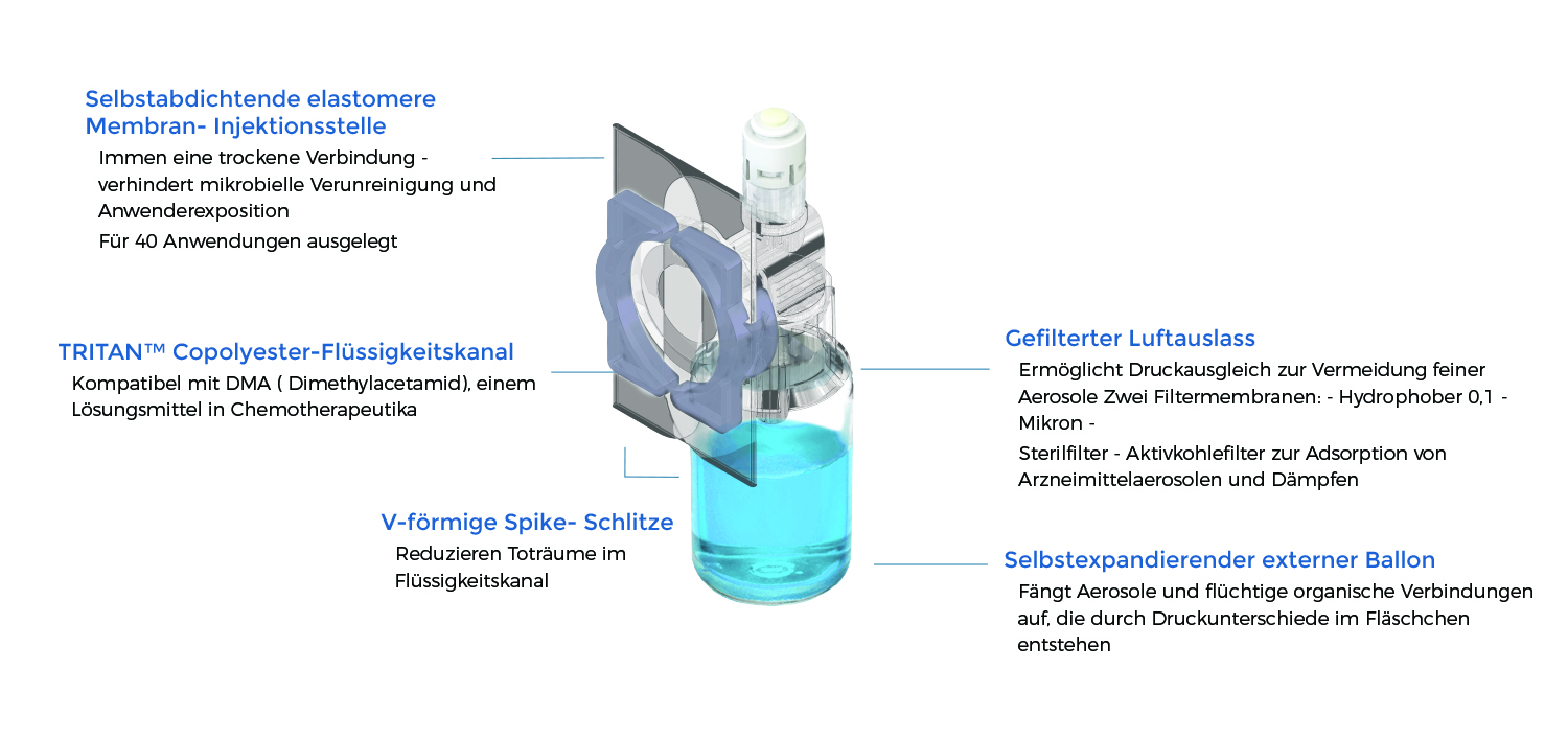 Dies verhindert die Bildung feiner Aerosole, die Umwelt, Patienten und medizinisches Personal potenziell gefährlichen Wirkstoffen aussetzen könnten – ein Risiko, das bei Druckunterschieden auftreten kann.